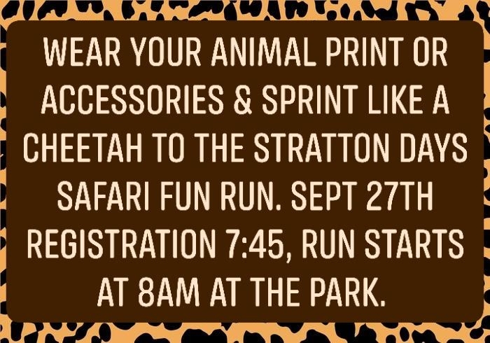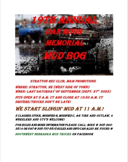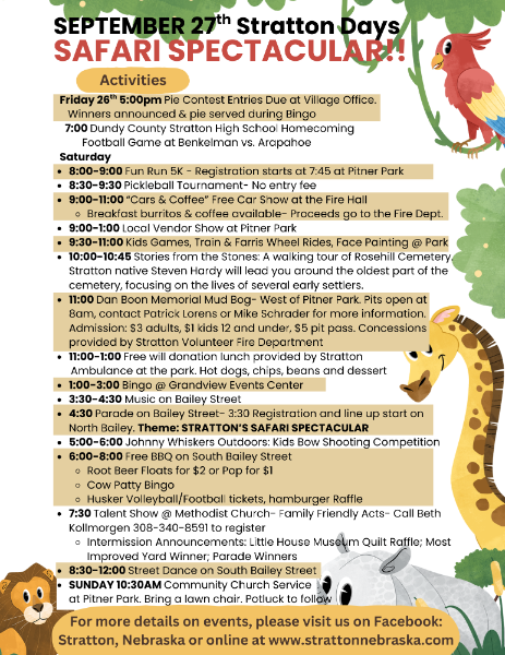 Start the weekend out testing your baking skills with the pie contest. Pie entries are due on Friday by 5pm at the Village Office then head over to Benkelman to watch the Dundy County Stratton High School Homecoming Football Game and crowing of Homecoming royalty. Saturday starts at the park with the fun run, pickleball tournament, and vendors and games at the park as well as a free car show at the Fire Hall. Don't miss a new event, walking tour of Rosehill Cemetery where you can learn some about early settlers of Stratton. The mud bog is back for the 19th annual Dan Boon memorial mud bog. The always popular Bingo at Grandview will serve pies and announce the winner from the pie contest. Then head to Bailey Street for music and the Safari Spectacular Parade to see who our Grand Marshals are this year! Have the kids stick around following the parade to compete in a bow shooting competition at Johnny Whiskers. Hopefully, you haven't filled up too much on the breakfast burritos at the car show or lunch at the mud bog provided by the fire department or hot dogs at the park from the Ambulance crew because you don't want to miss the Rec Club BBQ! Along with the free BBQ you can purchase a root beer float or get your final chance in the Rec Club Raffle for Husker Volleyball or Football tickets or a cooler of hamburger. The Little House Museum volunteers will also be around for tickets to their quilt raffle. Head back up the street to see some local talent as Beth Kollmorgen is again heading up the talent show. Then enjoy the DJ and street dance until midnight provided by the Rec Club. If you haven't worn yourself out, Sunday morning will be a community church service at the park with a potluck lunch to follow.